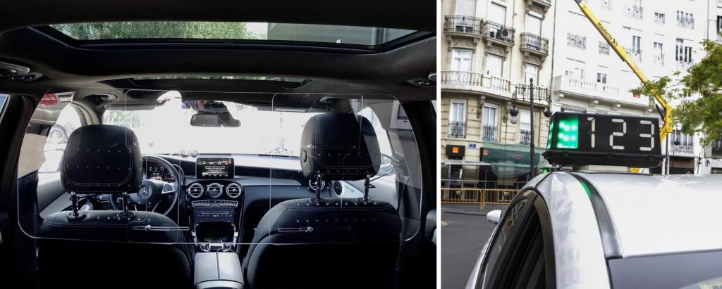 Una mampara de seguridad para el taxista (i) y un “tarifario” en el techo de un taxi.