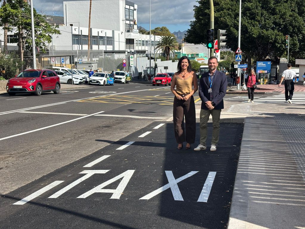 Precisamente, hace unos días, Evelyn Alonso (i) presentaba una nueva y mejor parada de taxis en el entorno del Hospital Universitario La Candelaria, junto con Gianfranco Bagnaresi, director del Gestión del centro hospitalario.