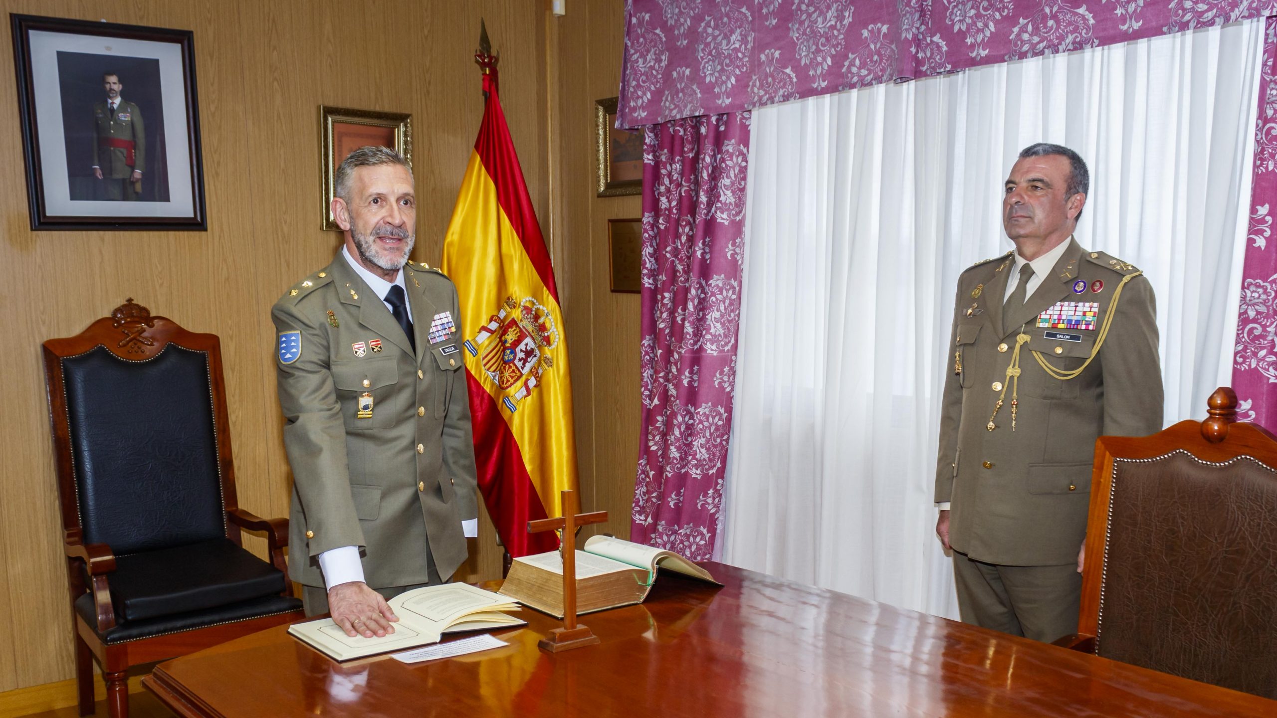 El teniente coronel Santiago Calleja Blancas (i) toma posesión de su cargo de jefe del RAAA 94, teniendo como testigo al teniente general Julio Salom, jefe del MCANA.